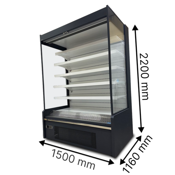 Довжина: 150см, глибина 116см, висота 220см. Температурний режим: +1..+10C. Тип охолодження: Відкритий. Потужність (номінальна/максимальна): 1000/2000 Вт. Хладагент: R507. Глибина викладки: 70см.