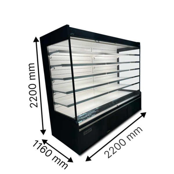 Довжина: 220см, глибина 116см, висота 220см. Температурний режим: +1..+10C. Тип охолодження: Відкритий. Потужність (номінальна/максимальна): 1600/2500 Вт. Хладагент: R507. Глибина викладки: 70см.