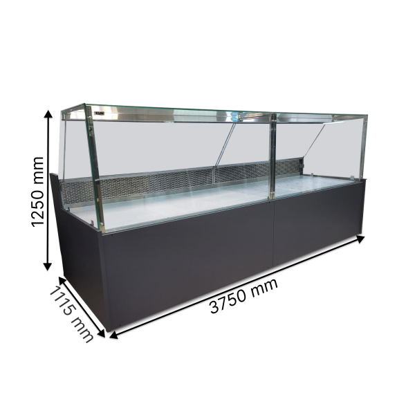 Довжина: 375см, глибина 111.5см, висота 125см. Температурний режим: -5…+5С. Тип охолодження: Статичний. Потужність (номінальна/максимальна): 1400/1700 Вт. Хладагент: R507. Глибина викладки: 79см.