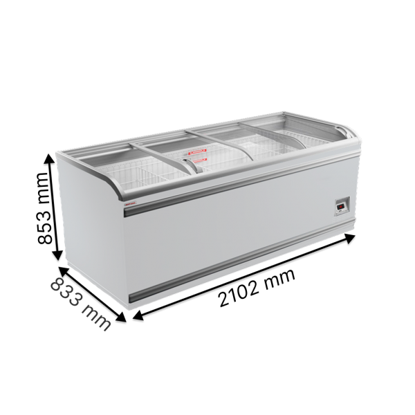 Длина 210 см, ширина 85 см, высота 83 см, на 6 ножках (колёса в заводской комплектации не предусмотрены), объём 900 л — популярные средние параметры для морозильных бонет массового использования. Высота без ножек 78 см — при необходимости заноса в более узкие проёмы ножки можно открутить.