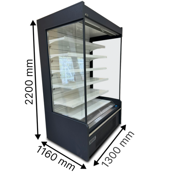 Витрина с фронтальными панелями без дверей, предназначена для демонстрации продуктов в открытом доступе.